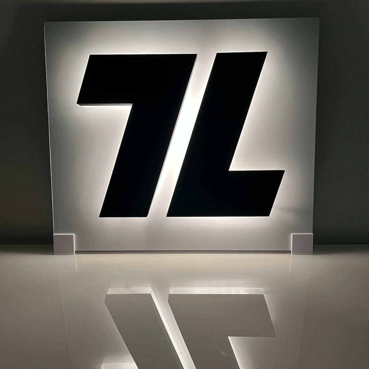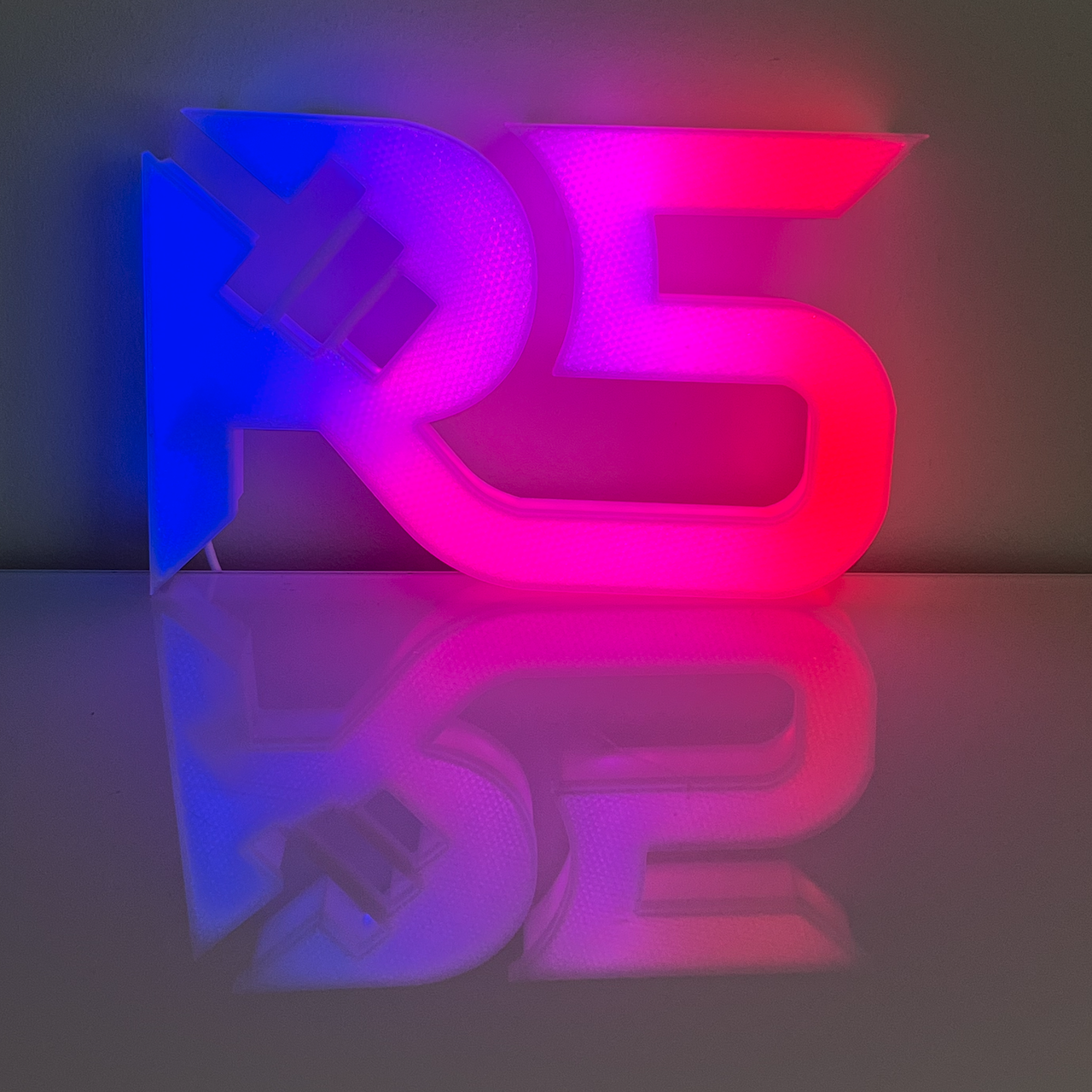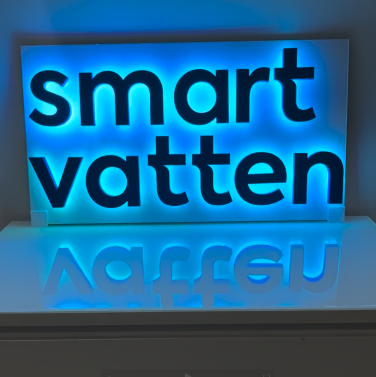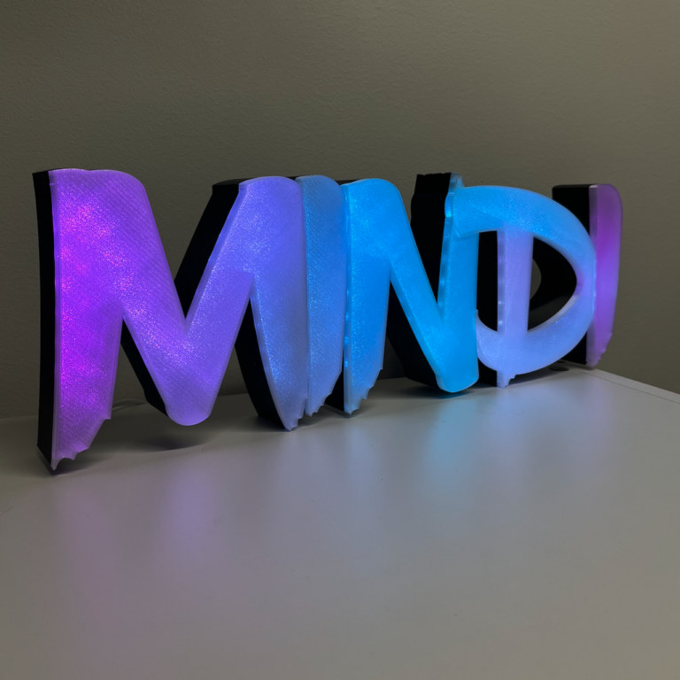 Yritykselle toteutettiin 3D-tulostettu-logo RGB-LED-valoilla, jotka ohjelmoitiin valmiiksi brändin värityksen mukaisesi.
