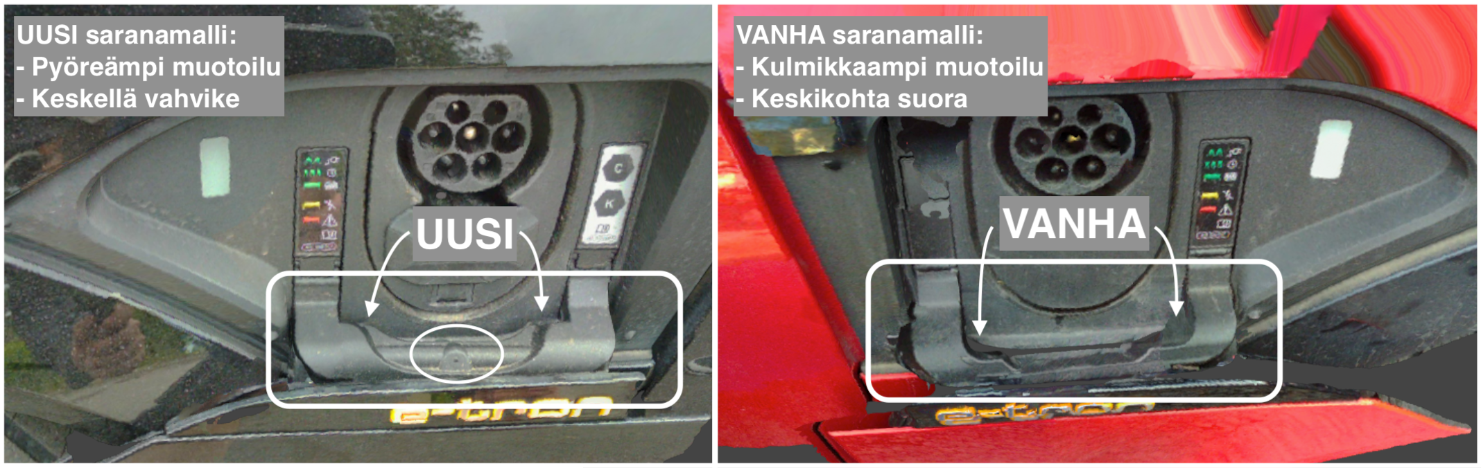 Suojia löytyy 4 eri mallia (vasen/oikea, uusi/vanha). Kuvissa on esitetty mallien erot (uusi/vanha), joten katso tarkkaan luukun saranoiden muoto ennen tilausta. Jos oikean mallin valinta tuntuu hankalalta, voit lähettää kuvan latausportin saranoista kun luukku on auki minulle, niin voin varmistaa, että oikea malli lähtee tuotantoon.